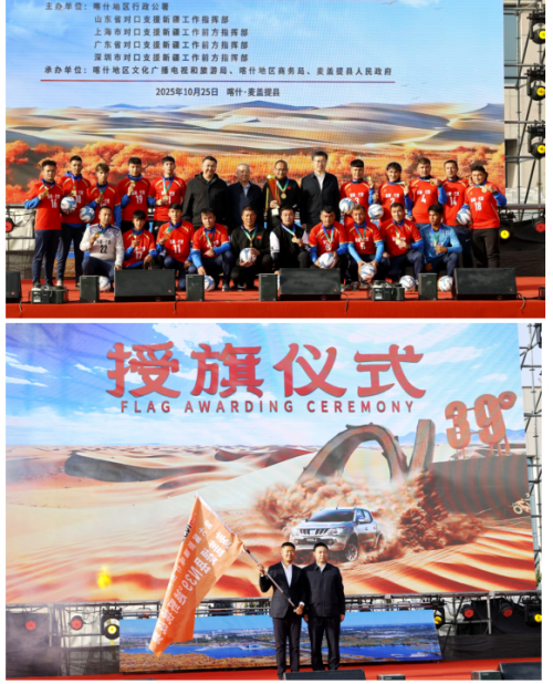 巴楚县胡杨足球队在贵州村超第二届“一带一路”国际友谊赛中,以顽强拼搏的表现生动诠释胡杨精神,相关领导为该队颁奖,并为越野挑战赛举行授旗仪式。