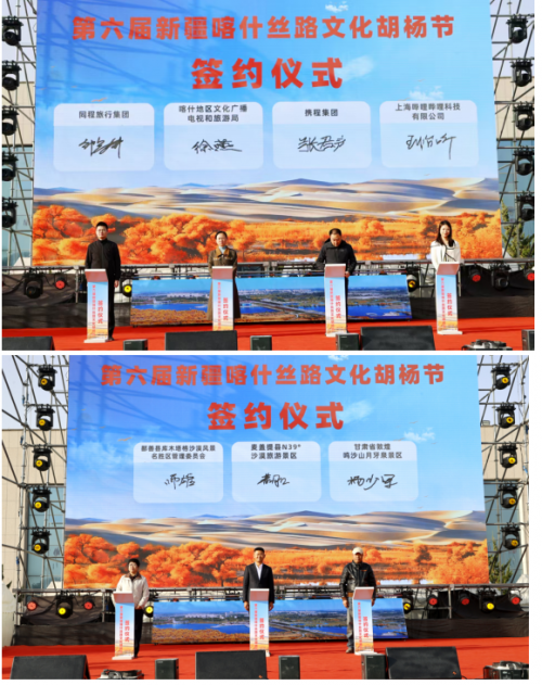 开幕式上,地区文化广播电视和旅游局与携程集团、同程旅行集团、哔哩哔哩等国内头部文旅平台完成战略合作签约,为当地文旅资源推广与品牌打造搭建专业平台。麦盖提县N39°沙漠旅游景区、鄯善县库木塔格沙漠风景名胜区管理委员会、甘肃省敦煌鸣沙山月牙泉景区签署战略合作框架协议,西部沙漠旅游联盟同步成立,助力跨区域沙漠旅游资源协同发展。
