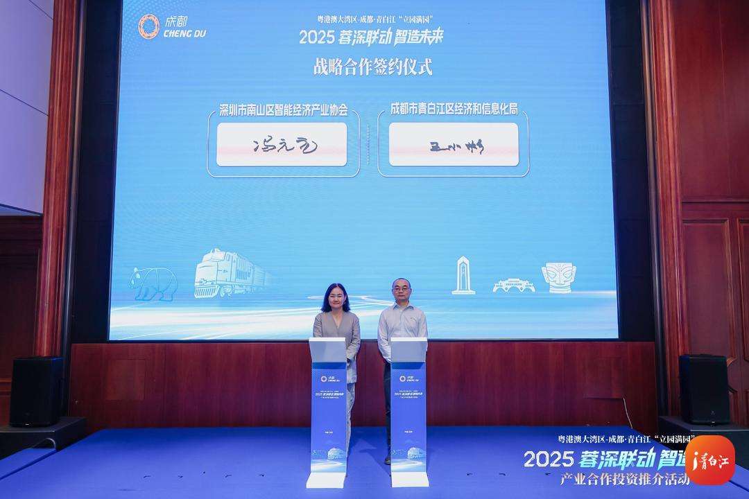 为给蓉深产业合作装上“持久引擎”,活动中,青白江区经信局与深圳市南山区智能经济产业协会签署了战略合作框架协议。此举旨在聚合协会在智能经济领域的资源高地与青白江的产业承载优势,共同在新一代信息技术、人工智能、智能制造等前沿领域播种未来。
