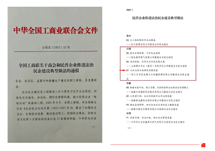 在第六届民营经济法治建设大会上,全国工商联发布《关于商会和民营企业推进法治民企建设典型做法的通报》,百岁坊品牌在推进法治民企建设方面的实践案例成功入围。