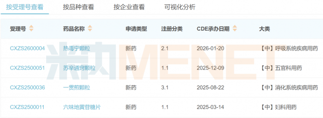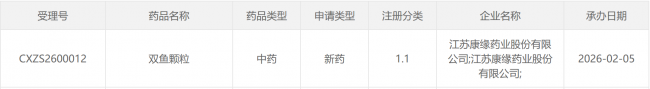 米内网数据显示,康缘药业于2023年11月公示双鱼颗粒的III期临床试验(登记号为CTR20233845);2024年6月,该临床试验顺利完成,并于2026年2月申报NDA获受理(受理号为CXZS2600012),上市可期。