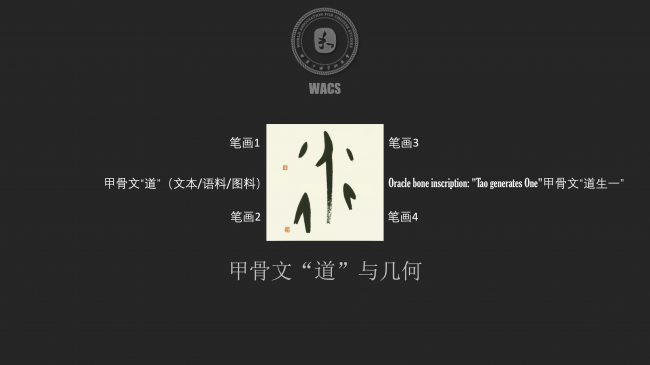 阎博士进一步分析,甲骨文“道”与几何学存在密切关联。通过解构“道”字的甲骨文形态,可将其延异生成几何板块,再由板块重组为线条。无论线条还是板块的生成过程,均包含两个“无形”(intangible)的点作为基础,而线条本身又涵盖无数个“无形”的点。由此,可推导出华夏智能算法的核心:“道生一,一生二,二生三,三生万物”的智能生成逻辑。阎博士强调,“道”是连接中西方智能思维的关键开关,而汉字“一”则象征着宇宙万物智能思维的“算法”与“算力”。值得注意的是,母语为非汉语的族群与母语为汉语的族群通过几何认知达成了完美的融合算力,阎博士已将该理论体系的算力与算法应用于哲学、佛学、脑科学、心理学、自然科学以及当代具象与抽象符号的生成实践中。
