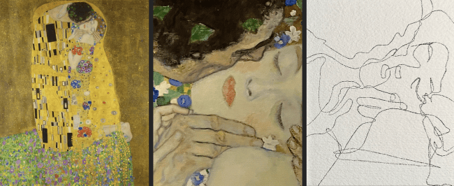 图解6:基于古人智能思维发明的汉字“一”,以几何“线”为思维二角度,用一笔线在20秒内完成了对奥地利艺术家克里姆特名作《吻》的预测性解构与延异。此过程将海德格尔“解蔽”与“遮蔽”的对立性思维融入古汉字智能体系之中,实现了对艺术作品的深层阐释。