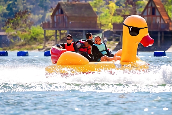踏入昔宜村,迎面而来的不仅是宜人的暖意,更有那如潮水般翻涌的超高人气。江面上,摩托艇如离弦之箭在浪尖飞驰,水上飞人脚踏飞行器一飞冲天,引得岸边游客阵阵惊呼;“小黄鸭”“碰碰船”等亲子游乐项目里,欢声笑语此起彼伏;步道上,游客们手持烤肠,笑容满面,热闹场景颠覆了人们对传统山村春节的认知。