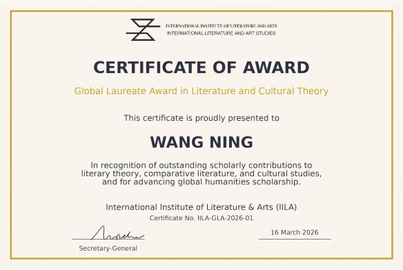 与此同时,国际文学艺术研究院还于2026年3月16日正式宣布,王宁院士荣获“全球文学与文化理论杰出成就奖”(Global Laureate Award in Literature and Cultural Theory)。该奖项是该学院设立的重要国际荣誉之一,旨在表彰在文学理论、比较文学与文化研究领域具有开创性贡献、并对全球人文学术发展产生深远影响的卓越学者。2026年度首次颁发,获奖者全球仅三位,分别是王宁(上海交通大学)、斯皮瓦克(Gayatri Spivak,哥伦比亚大学)、斯蒂芬·格林布拉特(Stephen Greenblatt,(哈佛大学)