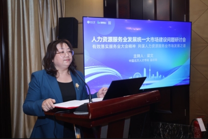 下午3时40分,人力资源服务业发展统一大市场建设问题研讨会同期举行。研讨会由中国北方人才市场副总裁梁文主持。萧鸣政教授首先致辞并作主题发言,指出本次研讨会是对落实全国服务业大会精神的精准化、实操化、顶层化落地,要求各位嘉宾围绕统一大市场建设,结合行业特点聚焦制度壁垒、标准统一、数据联通等痛点展开讨论,探讨人力资源服务业如何驱动其他服务业发展,发挥“第一服务业”的引擎作用。