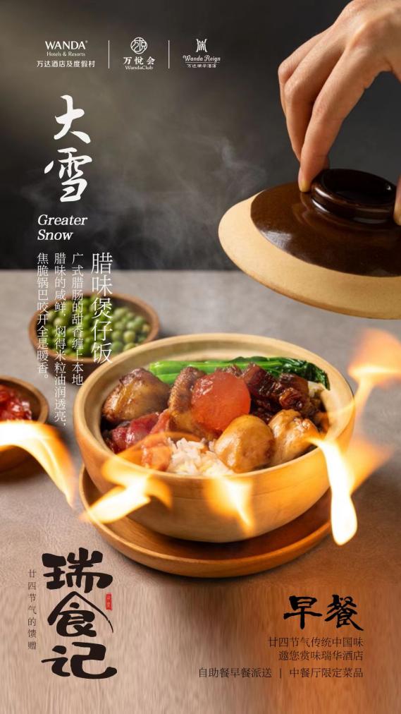 “瑞食记”是万达酒店及度假村旗下万达瑞华酒店品牌打造的节气美食IP,旨在以食物为媒介,传递“应时而食”的中式生活哲学。本次推出的“瑞雪丰年颂冬绥·烟火盛处浸蜜食”延续了该系列“传统中国味”的核心内涵,海报设计以暖系风格突出烟火气息,配合“大雪”节气的淡雅意象,营造出温暖舒适的冬季氛围。