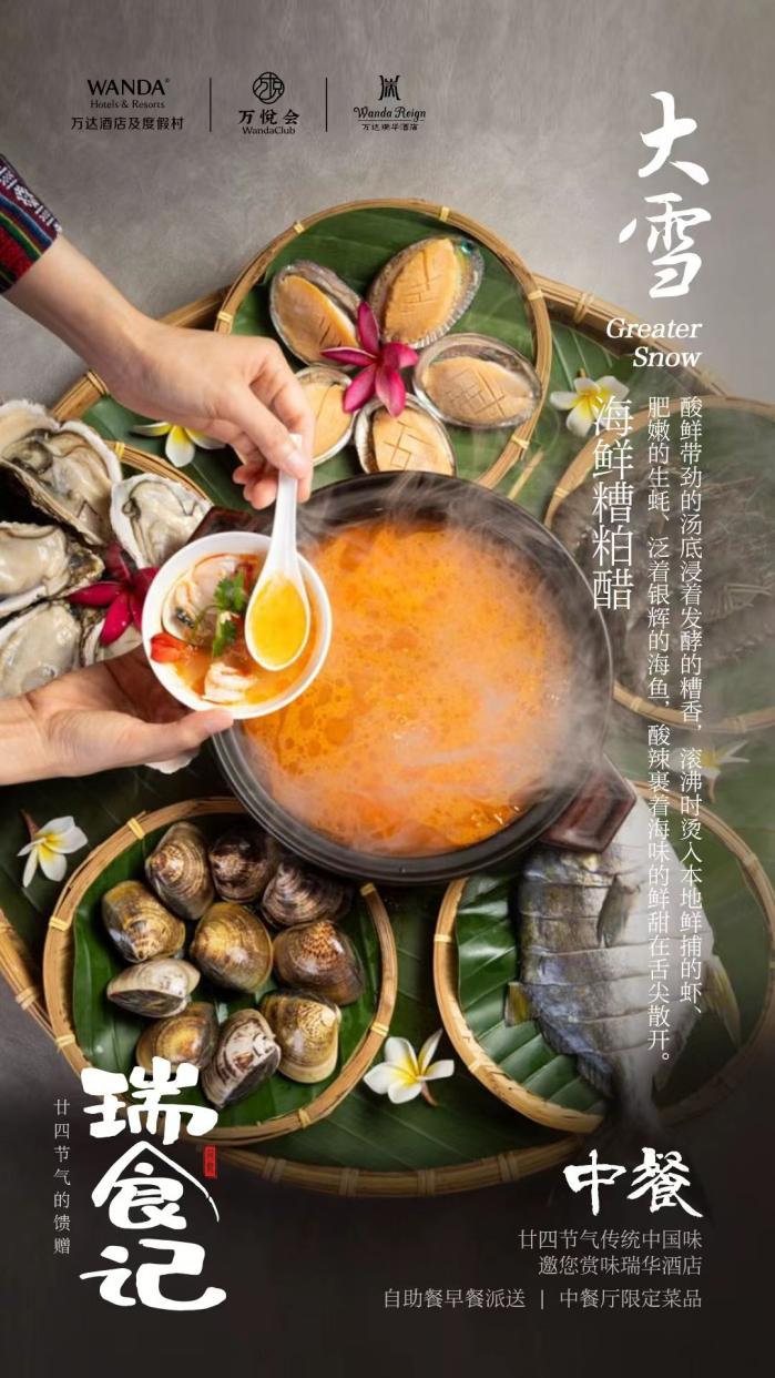 大雪凛冬,最宜用一锅热辣鲜醇的海鲜糟粕醋,唤醒味蕾的暖意。万达瑞华酒店《瑞食记》以二十四节气为引,在大雪推出这道特色海鲜糟粕醋,解锁冬日食鲜新方式。