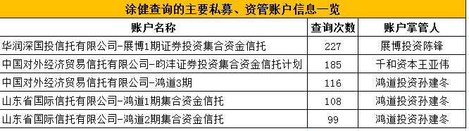 此外,涂健查询“中国对外经济贸易信托有限公司-昀沣证券投资集合资金信托计划”185次,查询“中国对外经济贸易信托有限公司-鸿道3期”116次。资料显示,前者系原“公募一哥”王亚伟掌管的千合资本账户,后者则为私募大佬鸿道投资孙建冬掌管的账户。此外,涂健还分别查询鸿道投资孙建冬掌管的鸿道1期、鸿道2期账户108次、99次。