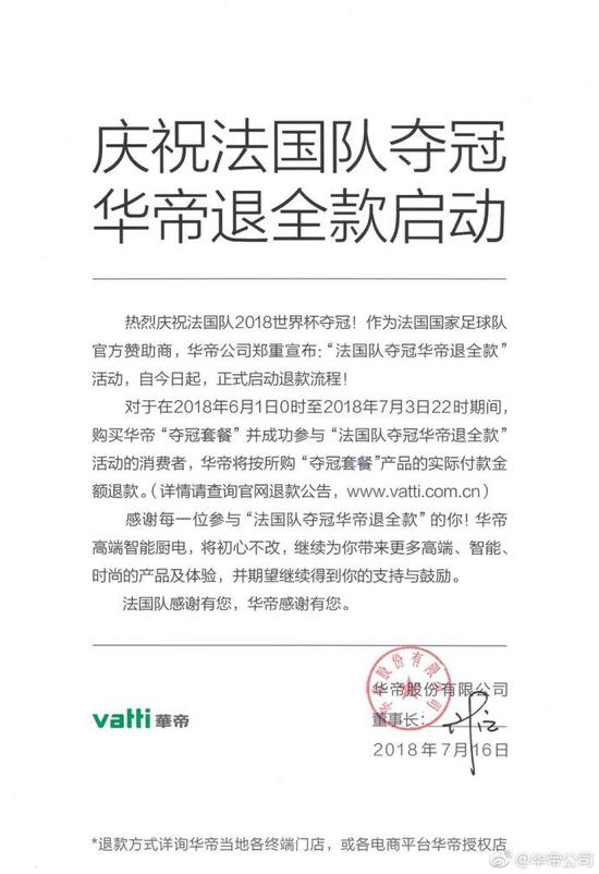 作为本届世界杯法国队的赞助商,华帝股份在今年世界杯营销方案为:若法国国家足球队2018年在俄罗斯世界杯足球赛中夺冠,则对在2018年6月1日0时至2018年7月3日22时期间,凡购买华帝指定产品并参与“夺冠退全款”活动的消费者,华帝将按所购指定产品的发票金额退款。而这笔货款的总金额不会超过7900万元。而随着法国队夺冠,世界杯落幕,正式启动退款活动。