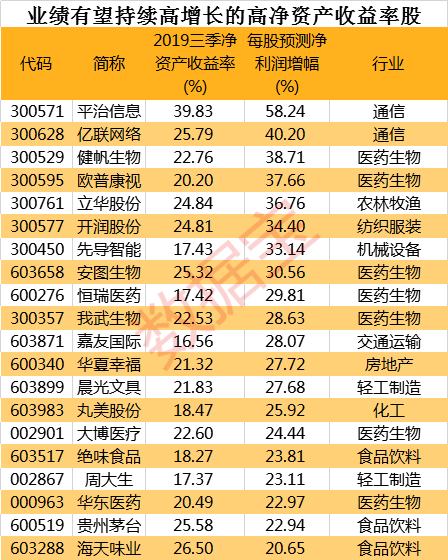 除平治信息外,还有易联网络、健帆生物、欧普康视、立华股份等,这4股今年净利润增幅有望超35%,易联网络更是具备“高送转”预期,并属于通信行业细分领域终端设备龙头。另外,海天味业、贵州茅台等明星股也在其中。
