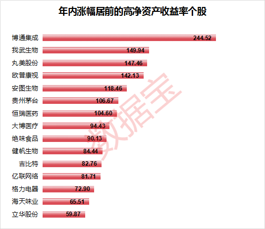 具体来看,涨幅居首的博通集成年内股价上涨244.52%,该公司过去五年平均净资产收益率达到34.45%,今年前三季也超过了20%,业绩增长十分稳定,公司主营无线通讯集成电路芯片研发销售,涉及华为、芯片、ETC等各种科技概念,前三季净利润同比增幅超120%。我武生物、欧普康视涨幅均超过140%。