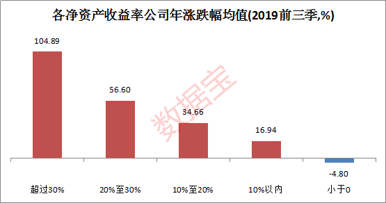 净资产收益率位于20%至30%的股票,平均涨幅也超过了55%;