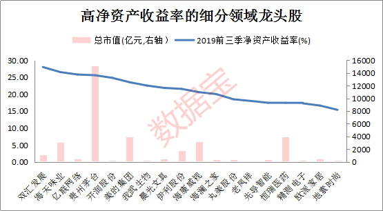 证券时报·数据宝统计显示,A股市场共有48股自2014年至2018年连续五年净资产收益率超20%,且2019年前三季ROE超过15%。主要来自于医药生物、食品饮料、家用电器等大消费类行业。