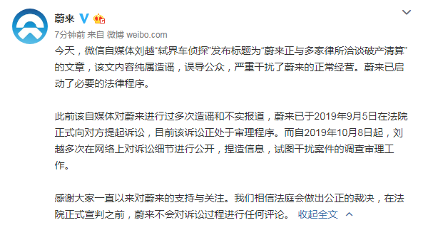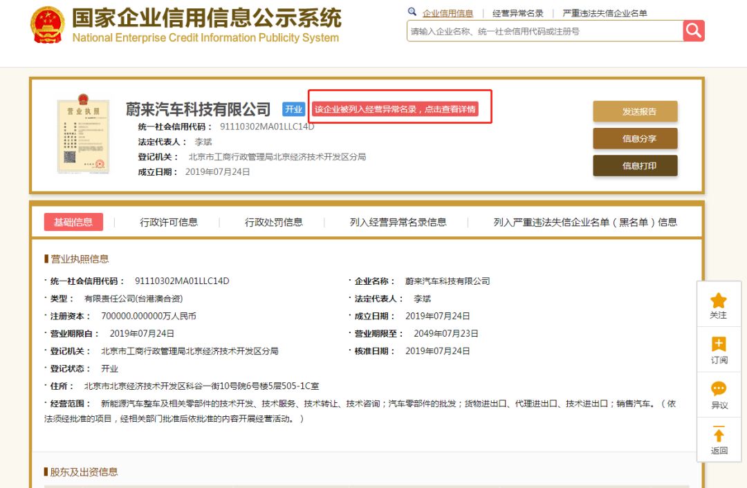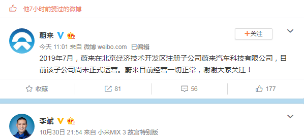 很快蔚来发布微博进行回应称,2019年7月,蔚来在北京经济开发区注册全资子公司蔚来汽车科技有限公司,该子公司尚未正式运营,蔚来目前经营一切正常。