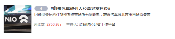 虽然新成立公司(蔚来汽车科技有限公司成立至今仅3个多月)没有进行实际经营活动被列入异常的情况并不鲜见,但又是“破产清算”,又是“经营异常”,蔚来因此迅速窜上热搜。