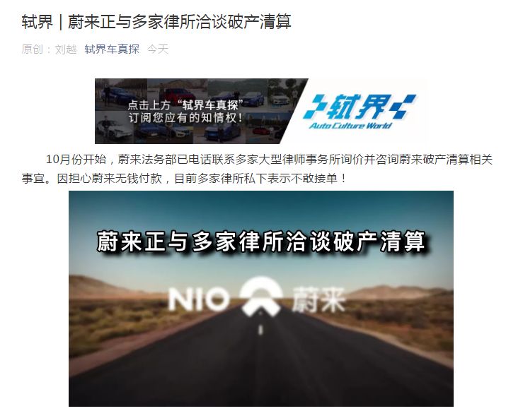 今天有媒体报道称,10月份开始,蔚来法务部电话联系多家大型律师事务所询价并咨询蔚来破产清算相关事宜。