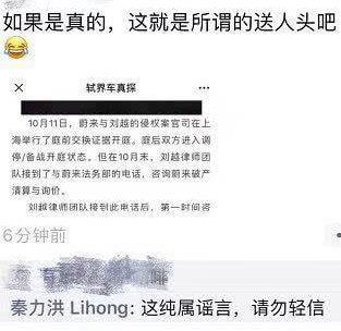 爆料文章指出,10月11日,蔚来与刘越的侵权案官司在上海举行了庭前交换证据开庭。庭后双方进入调停/备战开庭状态。