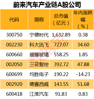 而自从投产以来,蔚来汽车被爆出的产业链企业涉及多家上市公司,包括做整车代工的江淮汽车(600418),做智能交互的德赛西威(002920)、科大讯飞,做电池模组的宁德时代(300750)等,涉及A股公司市值总和超过3700亿元。