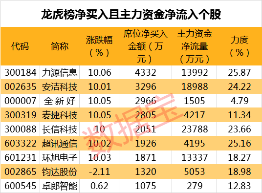 从盘口资金流向来看,主力资金净流入超千万且龙虎榜净买入个股共有11只,其中长信科技、安洁科技、力源信息等个股资金净流入金额最大。净流入力度最大的个股有印纪退、康弘药业、长生退,净流入力度分别为46.73%、27.61%、26.17%。
