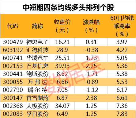 截至11月14日,87只个股5日、10日、20日、60日四条均线近日呈多头排列。其中神思电子、汇得科技、华域汽车股价与60日均线的乖离率最小,分别为3.97%、4.22%、5.05%。