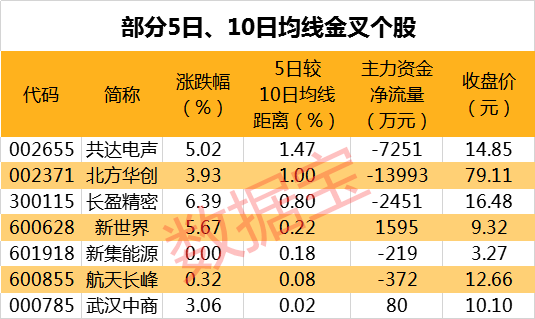 截至最新收盘,有7只A股的5日均线主动上穿10日均线,其中共达电声、北方华创、长盈精密等个股的5日均线较10日均线距离最大,分别达1.47%、1%、0.8%。