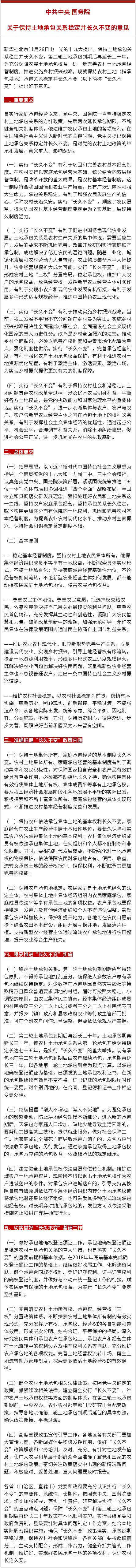 11月26日傍晚,《中共中央 国务院关于保持土地承包关系稳定并长久不变的意见》发布。