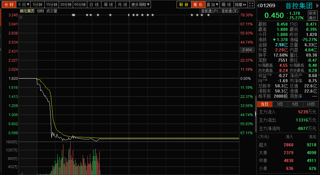 毫无征兆,11月27日首控集团(01269.HK)上午突然大跳水闪崩,大跌75.27%,收盘成仙股——0.45港元/股,市值仅剩下22.6亿港元,瞬间蒸发近70亿港元(约合62亿人民币),之后宣布短暂停牌。