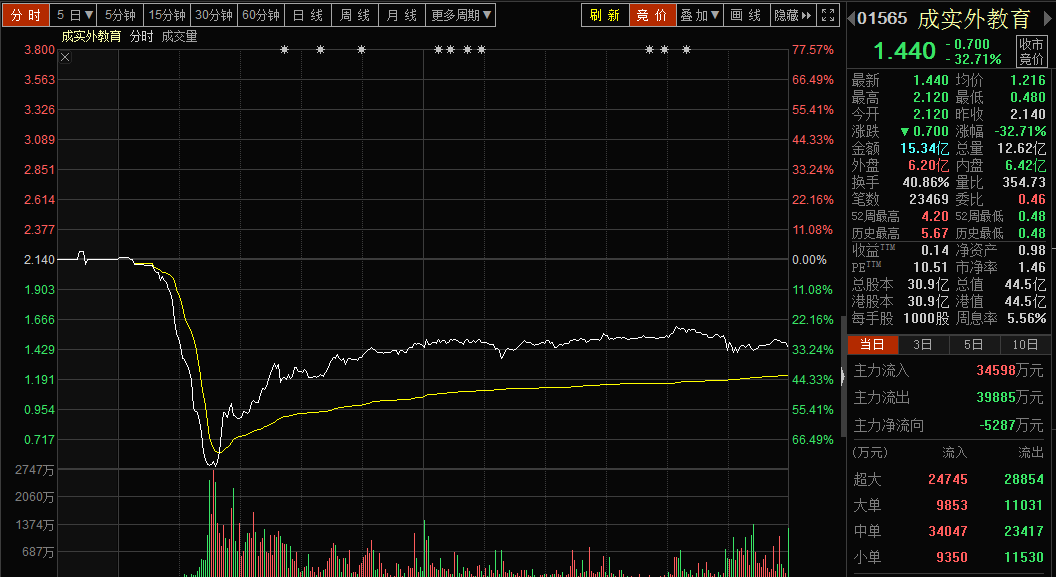 11月27日,成实外教育以2.12港元/股开盘后,9时50分开始大幅下跌,至10时18分大跌至0.495港元/股,最大跌幅达到76.87%,但后续有所收复,摆脱“仙股”阴影,截至收盘,成实外教育收于1.44港元/股,全天下跌32.71%。