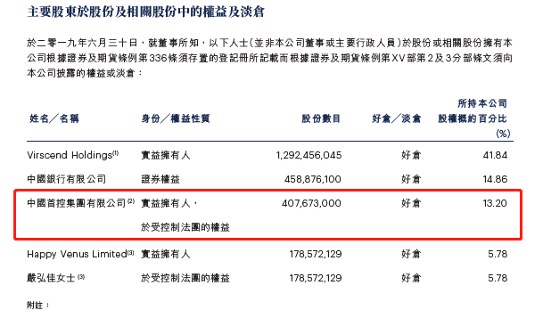 从首控集团股权来看,根据2019年中期报告,公司目前的第一大股东为创越、唐铭阳等一致行动人,合计持股8.04亿股,占总股本为16.0%,但其中的6.667亿股已经抵押给Champion Sense Global Limited,且在公司发行的可换股债券的转换权获全面行使后,还有244,648,318股股份将会配发予后者,而后者是中国华融旗下的全资子公司。
