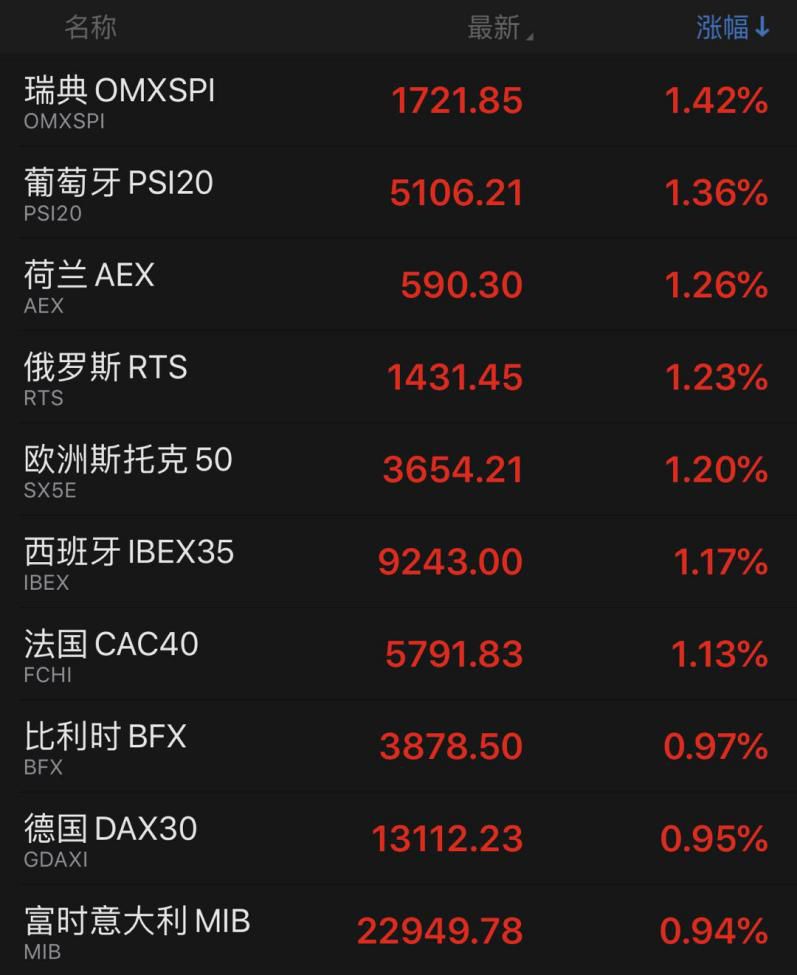 不止是美国股市,连续下跌的欧洲股市的反弹力度更大,除英国市场外,几乎全线上扬,而且上涨幅度不弱。