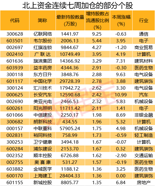 将时间拉长,51股被北上资金连续七周增仓。从持股比例变动情况来看,亿联网络获增仓幅度最大,北上资金持股比例相比7周前增加了9.25个百分点;其他增仓幅度较大的还有韦尔股份、红旗连锁、广联达等。