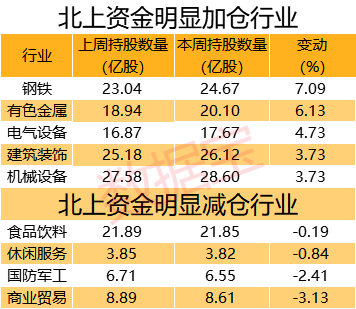 证券时报·数据宝统计显示,本周北上资金持股数量环比增加行业有24个,钢铁、有色金属、电气设备3个行业持股数量环比增加4%以上。