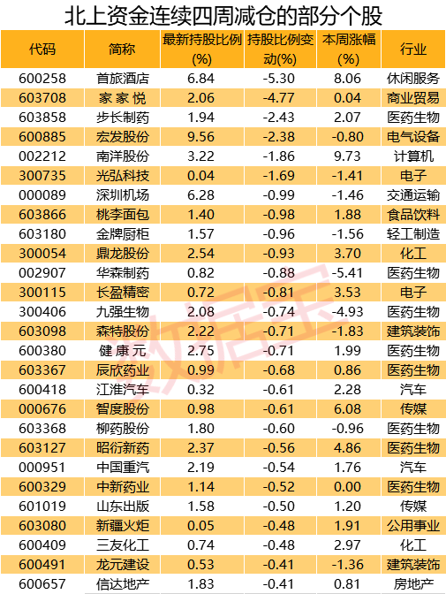 本周减仓的4个行业中,商业贸易行业减仓最为明显,本周北上资金持有该行业8.61亿股,环比下降3.13%。