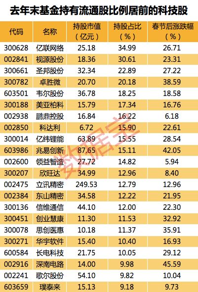 分析认为,科技类ETF和科技类新基金的火爆代表着增量资金对科技股前景的看好,科技股行情有望持续。据此,数据宝统计出去年四季度末基金抱团持有的科技股,以飨读者。
