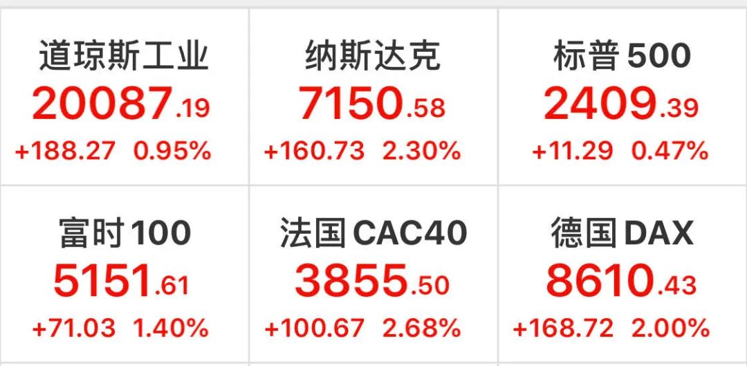截至收盘,道指收涨188.27点,涨幅0.95%,报20087.19点;纳指涨160.73点,涨幅2.30%,报7150.58点;标普500指数涨11.29点,涨幅0.47%,报2409.39点。