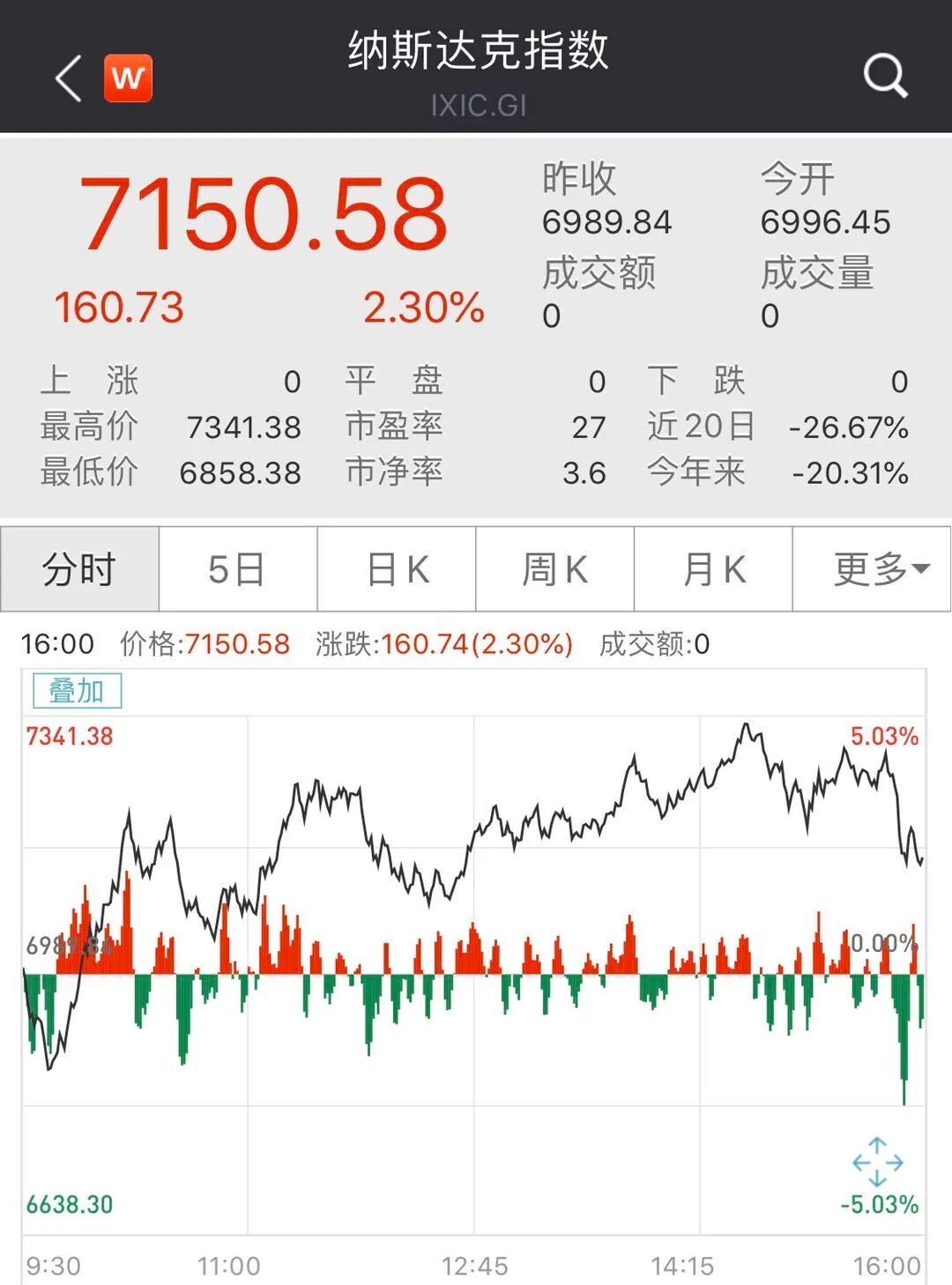 经历大幅震荡后,隔夜美股三大股指集体收涨。道指收涨188.27点,涨幅0.95%,报20087.19点;纳指涨160.73点,涨幅2.30%,报7150.58点;标普500指数涨11.29点,涨幅0.47%,报2409.39点。
