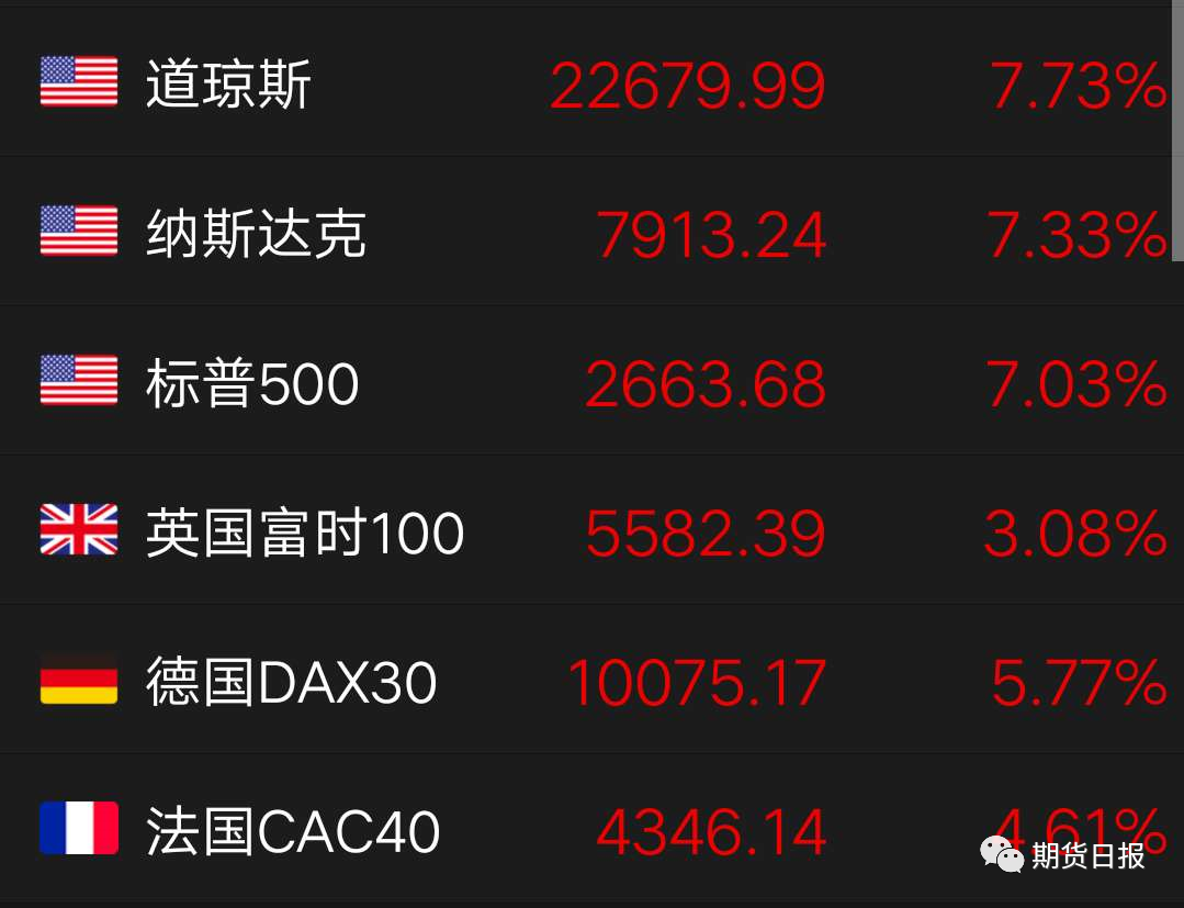 近日美国、意大利的疫情扩散情况有所改善,为全球股市带来回暖的契机。周一全球市场普遍大涨。标普500指数收盘上涨175.00点,涨幅7.03%,报2663.68点;纳斯达克指数涨540.20点,涨幅7.33%,报7913.24点;道琼斯指数收盘上涨1627.50点,涨幅7.73%,报22679.99点。
