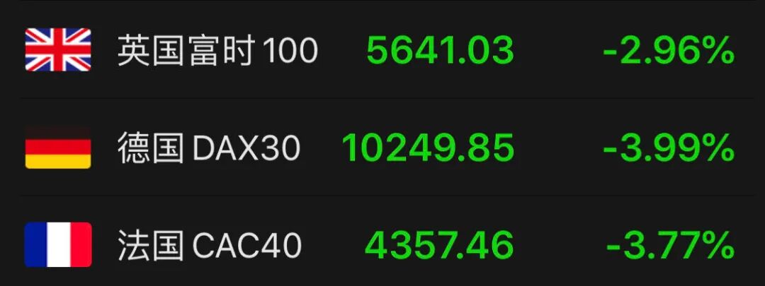 欧股方面,欧洲三大股市集体收跌。截至收盘,英国富时100指数跌2.96%,德国DAX30指数跌3.99%,法国CAC40指数跌3.77%。