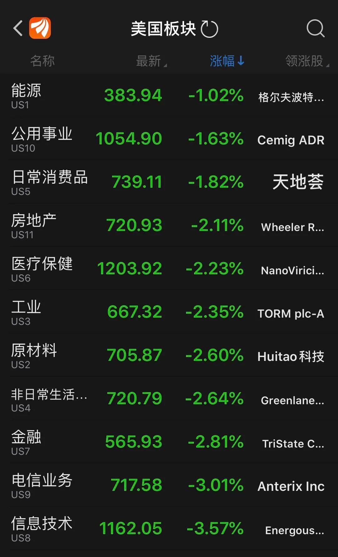 美国能源股也集体走低,埃克森美孚跌0.51%,雪佛龙跌2.36%,康菲石油跌3.96%,斯伦贝谢跌3.42%,EOG能源跌1.58%。